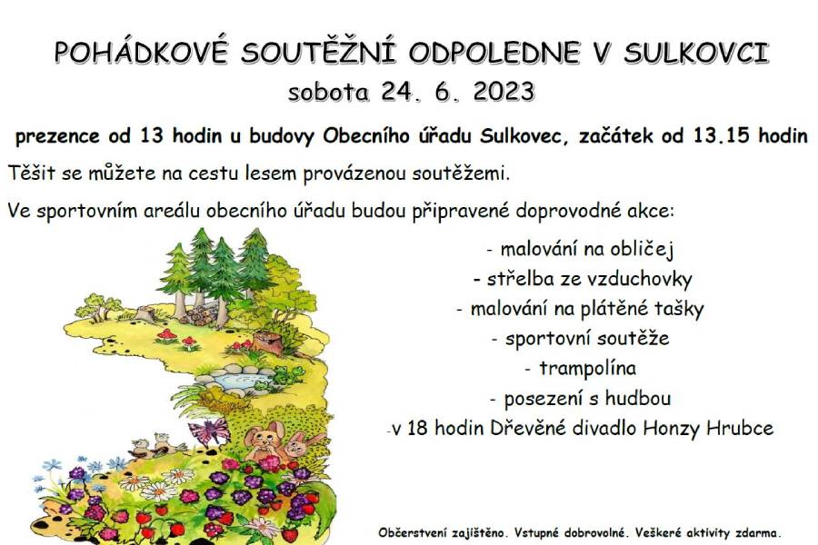 Kromě pohádkové cesty bude ve sportovním areálu obecního úřadu v Sulkovci připraven pestrý program s hudbou a bohatým občerstvením. Malí návštěvníci si užijí sportovní soutěže, střelbu ze vzduchovky, ale i malování na obličej či trampolínu. Vstupné je dobrovolné, veškeré aktivity jsou zdarma.