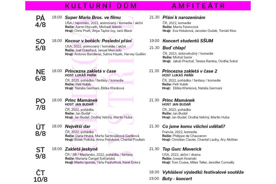 Již osmý ročník oblíbeného studentského festivalu proběhne ve dnech 5.-10. srpna v Bystřici nad Pernštejnem. V kulturním domě si malí i velcí diváci užijí promítání pohádek, v amfiteátru na Masarykově náměstí pak návštěvníci každý večer zhlédnou jeden z filmů.
