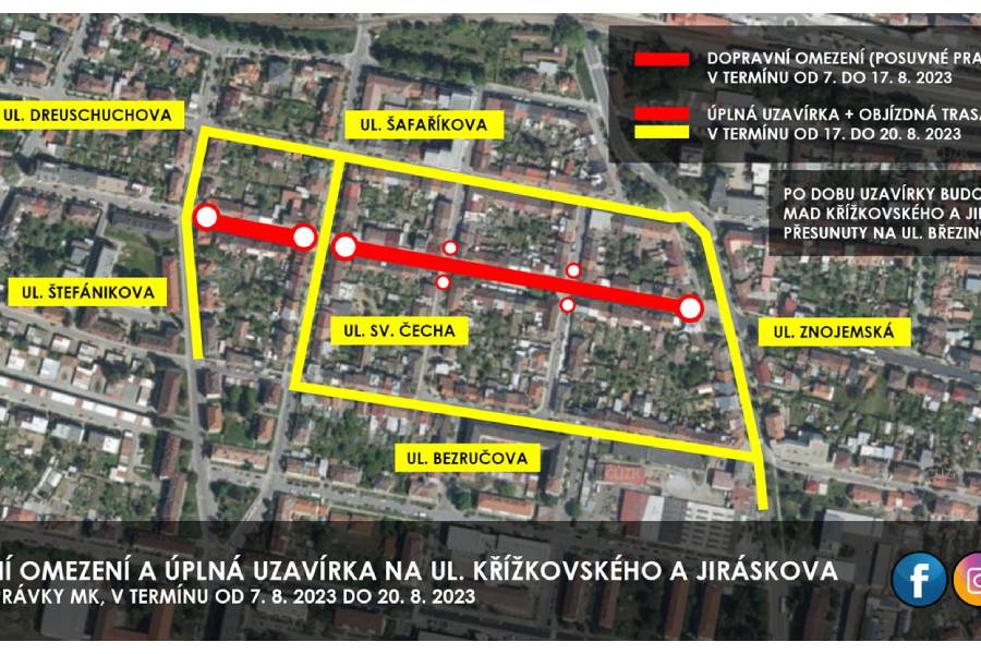 V ulicích Křížkovského a Jiráskova odstartují v pondělí 7. srpna práce na opravě silnice. Až do 17. srpna budou probíhat za provozu, silničáři odfrézují starý asfaltový povrch, vymění obrubníky a provedou další přípravné práce. Poté budou obě ulice kvůli pokládce nového asfaltu uzavřeny. Objížďka povede ulicemi Znojemská, Šafaříkova, Dreuschuchova, Štefánikova, Sv. Čecha a Bezručova. Uzavírka bude ukončena v neděli 20. srpna.