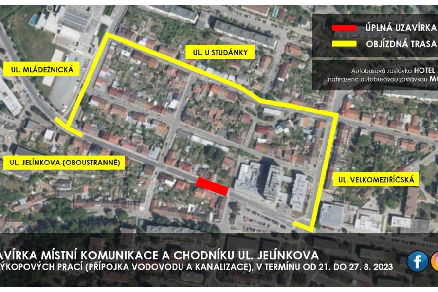 Další uzavírka se dotkne ulice Jungmannova, a to z důvodu pokládky teplovodní přípojky. Ulice bude od 9. do 31. srpna zcela uzavřena. Uzavřen bude v srpnu i úsek v Jelínkově ulici, a to od 21. do 27. srpna. Na místě proběhnou výkopové práce kvůli přípojce vodovodu a kanalizace. Uzavřený úsek budou moci řidiči objet po ulicích Velkomeziříčská, U Studánky, Mládežnická a Jelínkova.