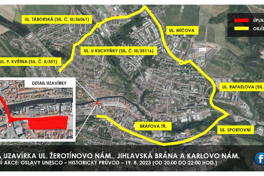 U příležitosti oslav 20. výročí zapsání Třebíče na seznam UNESCO bude v pondělí 14. srpna a od čtvrtku 17. do neděle 20. srpna uzavřeno parkoviště v ulici Pod zámkem. Ve čtvrtek 17. srpna bude zároveň uzavřena židovská čtvrť, z důvodu konání doprovodného programu oslav Toulky židovskou minulostí.