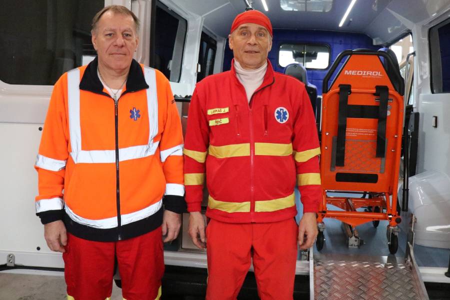 Řidiči Martin Matuška a Jaroslav Lankaš už obdrželi klíčky od vozů a zanedlouho je čeká první jízda. „Je to už moje třetí sanitka. Tou předchozí jsem jezdil dvanáct let. Za tu dobu jsem s ní najezdil 480 tisíc kilometrů,“ popisuje Martin Matuška.