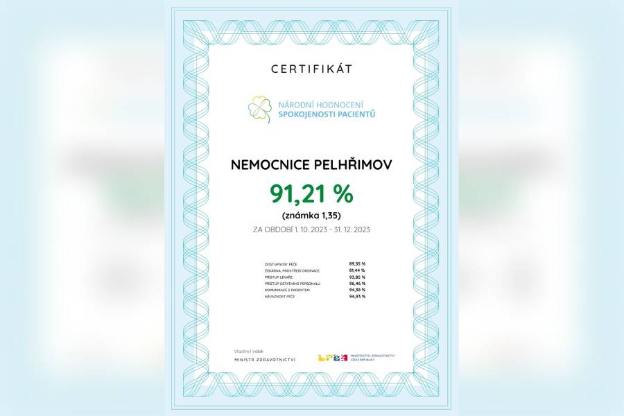 Pilotního programu Národního hodnocení spokojenosti ambulantních pacientů se kromě pelhřimovské nemocnice zúčastnilo dalších šest zdravotnických zařízení. Nejlépe hodnocená nemocnice získala známku 1,31, tedy 92,25 procent.