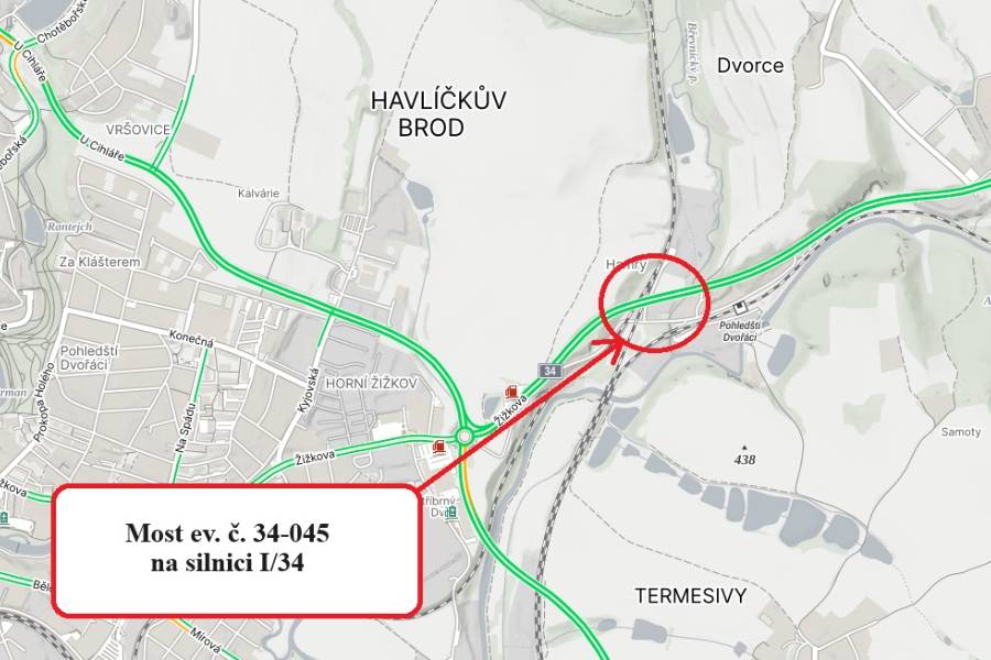 Uvedený most převádí silnici I/34 přes železniční trať a Břevnický potok. Denně po něm projede na 9 tisíc vozidel, z toho cca 28 procent tvoří nákladní vozidla a kamiony. „Diagnostika prokázala dožilý stav mostního svršku, zejména říms, zábradlí, izolace a systému odvodnění,“ uvedl mluvčí ŘSD Jiří Veselý.