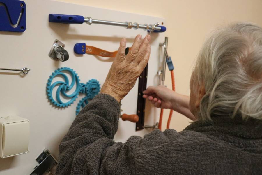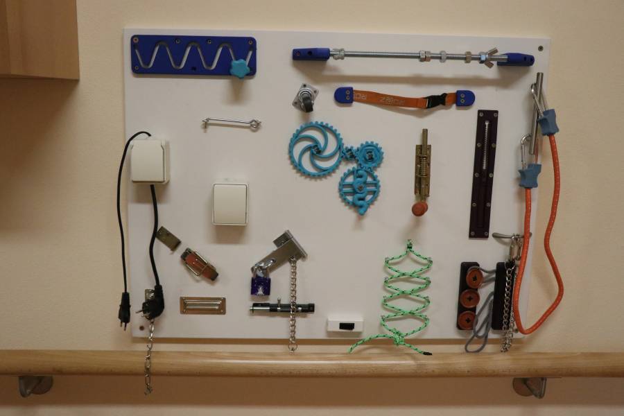 Pracovní tabule slouží k tréninku jemné motoriky ruky a k procvičování kognitivních schopností a dovedností. „Tabule máme dvě. Pacient u nich může stát nebo sedět a s fyzioterapeutkou procvičovat práci s předměty, s nimiž se běžně setkává ve své domácnosti. Cvičí zapínání a vypínání, šněrování, otvírání a podobně,“ doplňuje Kateřina Havlová.