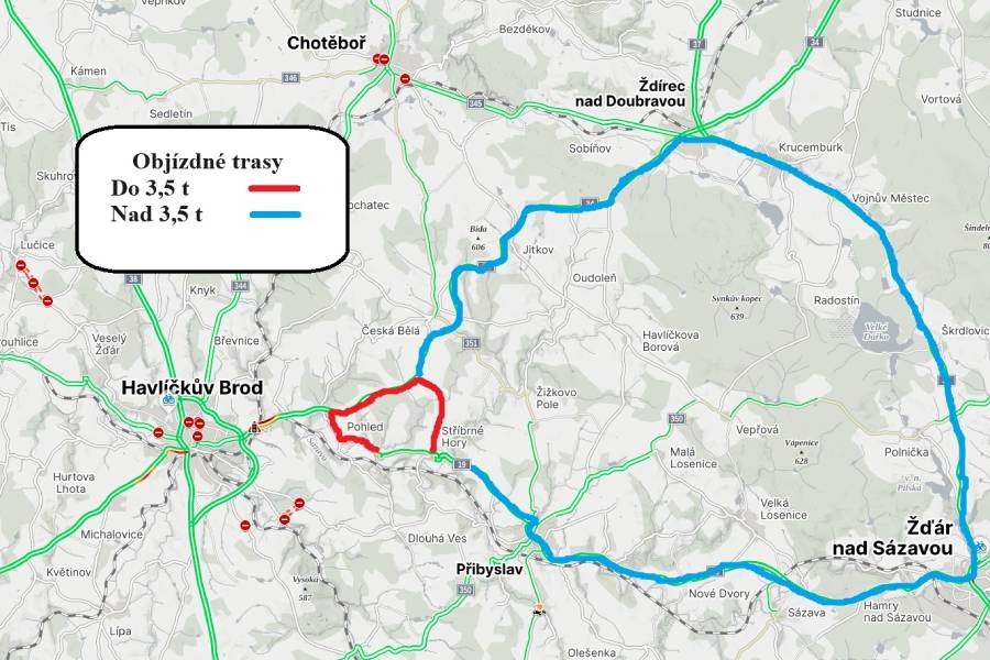 Vozidla nad 3,5 tuny: I/34 – Ždírec nad Doubravou – I/37 – Žďár nad Sázavou – I/19 – Přibyslav (obousměrně)