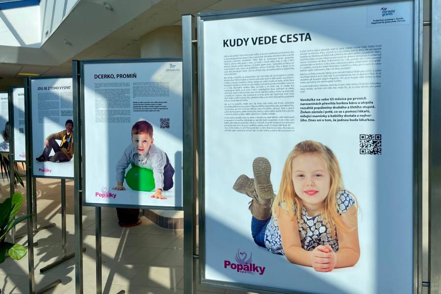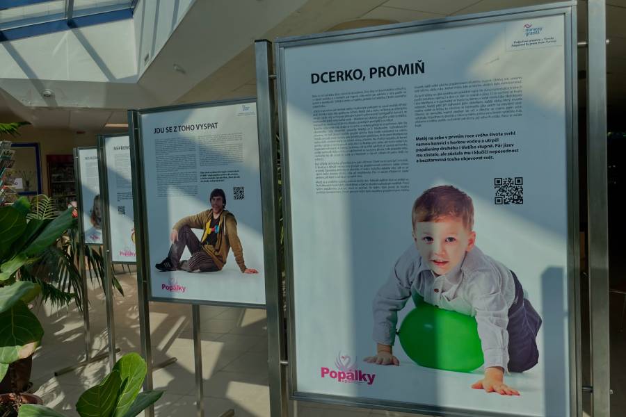 „Ve chvíli, kdy byl malý Kubík tři kroky od mámy a chtěl oběhnout ohniště, zakopl o jeden z kamenů kolem plápolajícího ohně a rukama instinktivně předpaženýma se zabořil do žhavých uhlíků. Obličejík skončil v plameni. Andrea u něj byla hned, ale i ta chvilka stačila. Začal boj o minuty. Zatímco nejstarší Jiřík držel v náručí bratříčka křičícího bolestí, máma běžela pro mokrý ručník a než přijela sanitka, tak chladili a chladili. Popálenina nevypadala nijak drasticky, ale když přiletěl vrtulník, Andrea zpanikařila. Kubíka už v umělém spánku odvezli do Brna. Andrea, Kateřina i ostatní děti zůstaly na chatě jak v rozbitém hnízdě samy,“ to je jen kousek jednoho z lidských osudů, které vás na výstavě osloví.