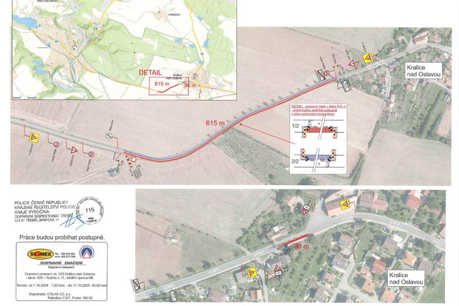 Opravovaný úsek je dlouhý přes 600 metrů a začíná před Kralicemi nad Oslavou od značky obce ve směru od Náměšti nad Oslavou. „Kromě toho bude lokálně opraveno 30 metrů jízdního pásu směr Rapotice přímo v Kralicích nad Oslavou mezi ulicemi Ke Chmelencům a Ve Zmolách,“ uvedl mluvčí ŘSD Jiří Veselý.