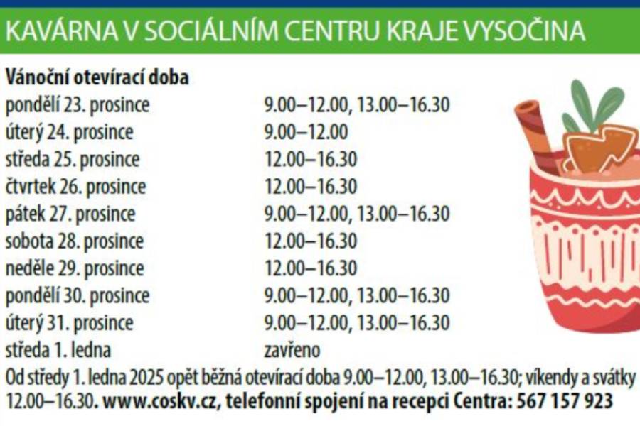 Ne každý má to štěstí trávit Vánoce v kruhu svých blízkých. Mnozí lidé, často zejména senioři, si tak mohou připadat osamělí a smutní. A právě návštěva kavárny může být tou správnou volbou. „Přidanou hodnotou kavárny může být navázání nových kontaktů a možnost strávit nejcitlivější období roku v příjemné společnosti,“ doplňuje radní Kraje Vysočina Jiří Horký.