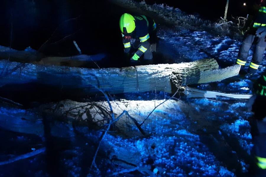 „Dnes před šestou hodinou ráno padl strom na projíždějící nákladní vůz u obce Stáj na Jihlavsku. Strom poškodil kabinu i návěs vozidla,“ doplnila mluvčí. Událost se naštěstí obešla bez zranění.