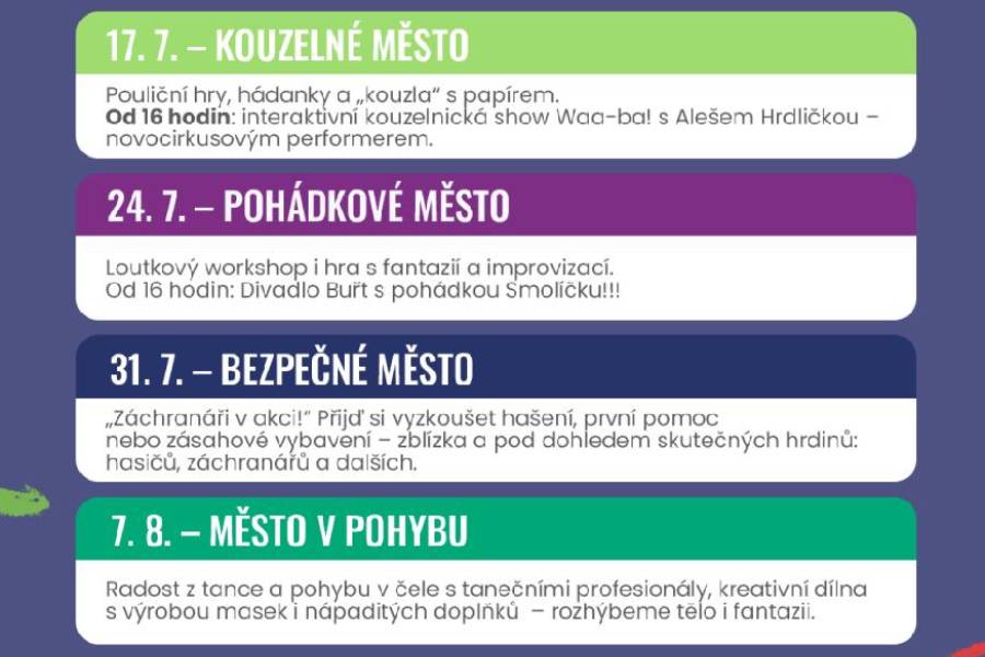První prázdninové odpoledne proběhne ve čtvrtek 17. července. Malým i velkým návštěvníkům nabídne pouliční hry, hádanky a tvoření z papíru. Hlavním lákadlem bude v 16:00 interaktivní kouzelnická show Waa-ba! v podání novocirkusového performera Aleše Hrdličky, která slibuje spoustu humoru, triků i zapojení publika.