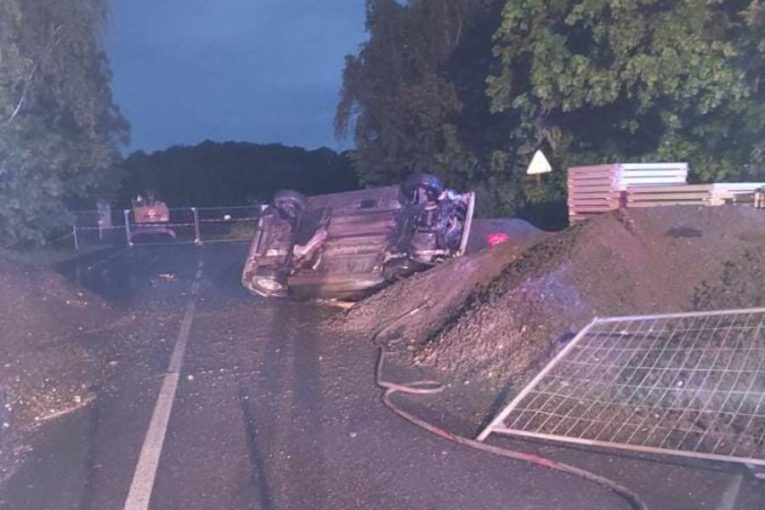 Nehoda na staveništi u Habrů. Řidič vjel do zákazu a převrátil auto na bok