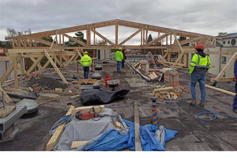 Na vstupním pavilonu novoměstské nemocnice vzniká provizorní střecha. Dělníci poté rozeberou původní