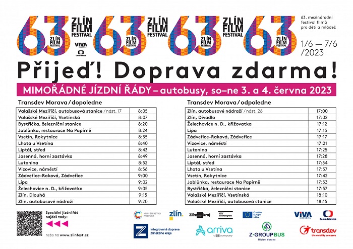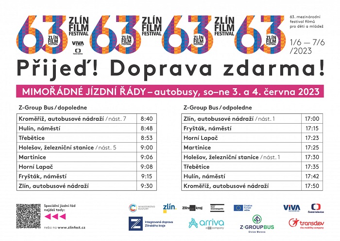 O víkendu 3. a 4. června vyjedou dva páry mimořádných autobusů na trasách Valašské Meziříčí – Vsetín – Vizovice – Zlín a Kroměříž – Holešov – Fryšták – Zlín a zpět. Zájemci o festivalový program se tak dopoledne dostanou dvěma bezplatnými autobusy do Zlína a k večeru se opět budou moct stejnou trasou vydat zpět domů.