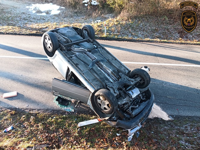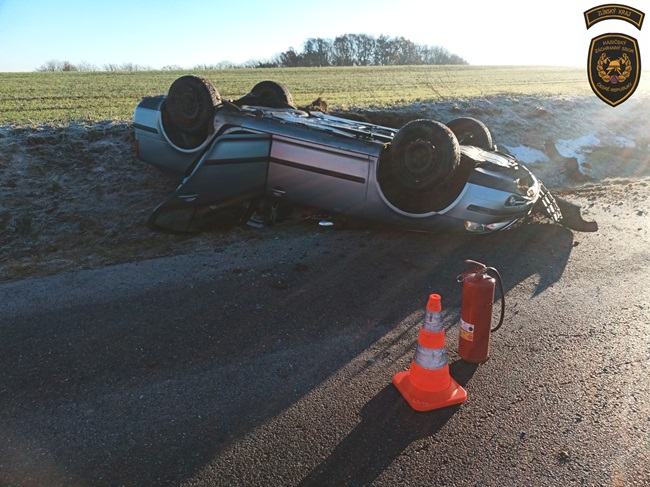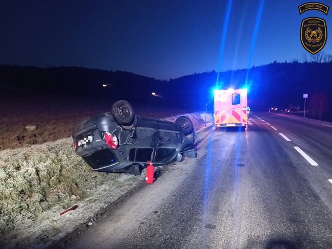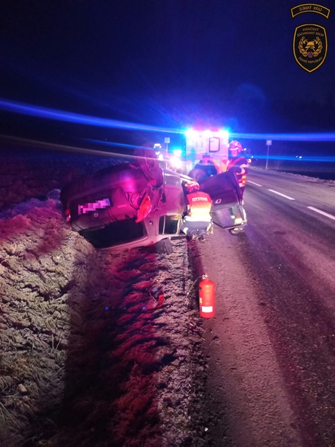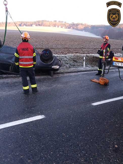 Další vůz skončil dnes dopoledne na střeše v příkopu, a to tentokrát u Velkého Ořechova na Zlínsku. „I zde byla namrzlá silnice. Obě ženy, řidička a spolujezdkyně, skončily v péči posádky zdravotnické záchranné služby,“ popsala Lucie Javoříková.