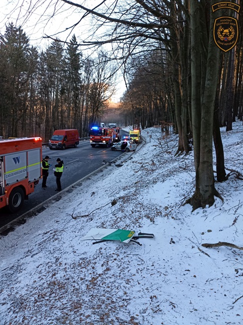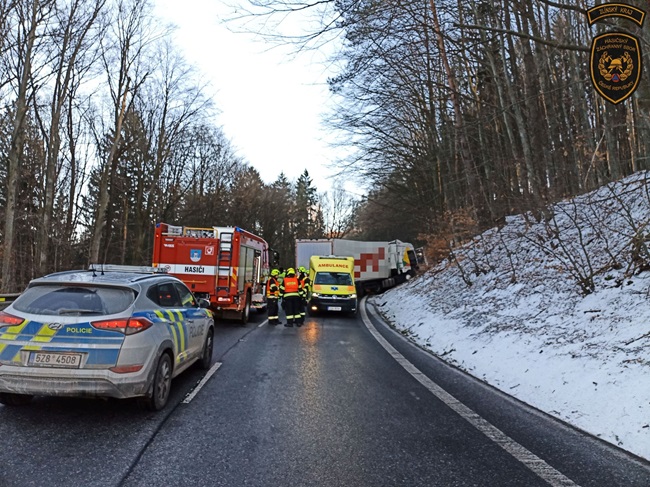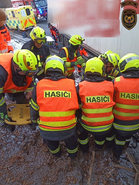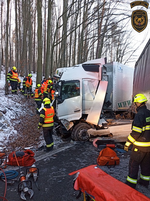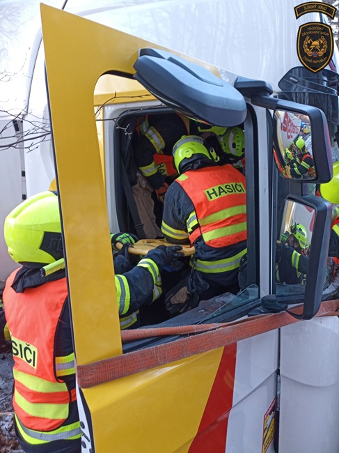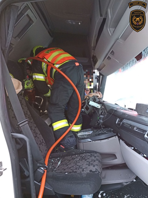 Po druhé hodině vyjely na místo tři jednotky hasičů. „Jeden zraněný řidič z nákladního vozidla zůstal zaklíněný v kabině a hasiči jej museli vyprostit za pomoci hydraulického vyprošťovacího zařízení. Poté ho na páteřové desce vytáhli z kabiny a předali záchranářům, kteří po celou dobu vyprošťování řidiče prováděli úkony přednemocniční neodkladné péče,“ popsal mluvčí hasičů David Martinec.