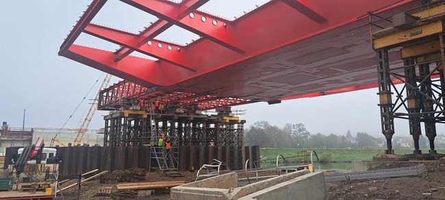 Stavební ruch u Napajedel neutichne ani v zimním období. „Montážní práce už nyní provádíme pod lokálním zastřešením a pro možné provádění protikorozní ochrany mostu budeme muset instalovat zastřešení celé šířky konstrukce. Toto zastřešení bude pohyblivé tak, aby byl možný posun při provádění těchto prací v různých podélných částech. Budeme dále tedy provádět práce na nosné konstrukci a budeme ji výsuny posouvat do definitivní polohy tak, abychom mohli na přelomu zimy a jara navést a namontovat oblouk. Na levém břehu řeky Moravy blíže k Otrokovicím chceme například do zimy postavit a zaizolovat opěrnou zeď a dále pracovat na násypu dálnice D55,“ doplnil Kubíček.