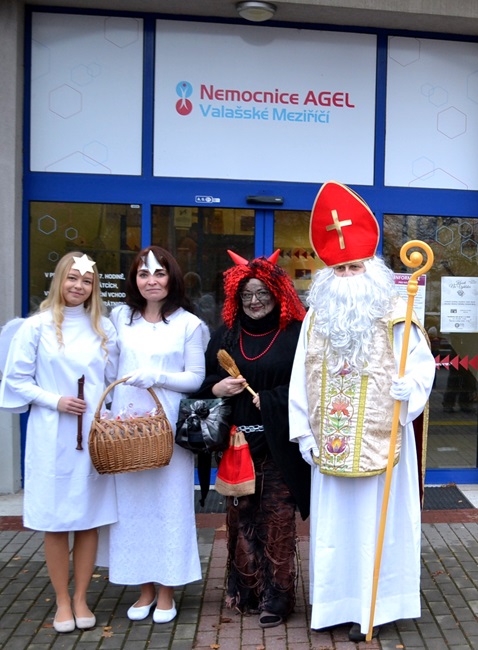 Mikuláš s družinou zavítal samozřejmě i na dětské oddělení. Děti potěšila nejen samotná návštěva Mikuláše, čerta a dvou andělů, ale také balíčky, které od nich dostaly. „Každoročně zveme Mikuláše, aby nám rozveselil malé i větší pacienty, kteří si nemohou užít svátky doma s rodiči a kamarády a musí je strávit v nemocnici. Na oddělení vždy panuje přátelská a pohodová atmosféra, která pacienty rozveselí a rozptýlí je,“ říká staniční sestra dětského oddělení Nemocnice AGEL Valašské Meziříčí Ludmila Hrbáčková.