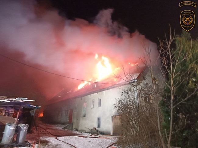 V době příjezdu hasičů hořelo ve sklepních prostorech a prvním podlaží. Požár se však rychle šířil dál směrem ke střeše. „Hasiči ihned zahájili hasební práce. Zásah však velmi komplikoval špatně dostupný terén. Hasičská auta nemohla vyjet až k těsné blízkosti domu, neboť silnice byla pokrytá ledem. Museli tak zůstat pod kopcem a natáhnout dopravní vedení. Likvidaci požáru vyhlásil velitel zásahu až třináct minut po půlnoci,“ popsala mluvčí hasičů Lucie Javoříková. Vše se naštěstí obešlo bez zranění.