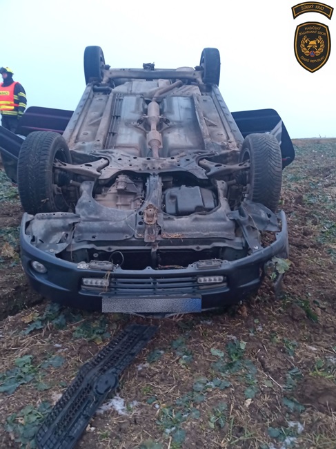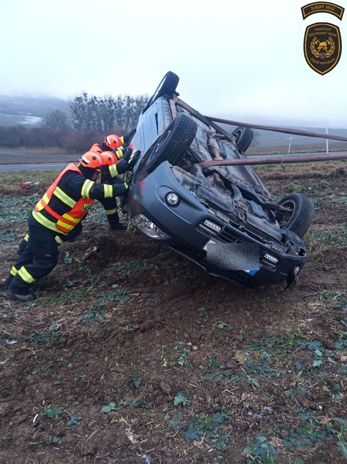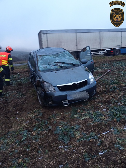 Na Kroměřížsku se bouralo ještě jednou, a to u Koryčan, kde skončilo vozidlo na střeše. Řidič z nehody vyvázl bez zranění a z vozu se dostal před příjezdem hasičů. „Na místo byli vysláni hasiči ze stanice Morkovice-Slížany a místní dobrovolná jednotka. Hasiči po provedeném průzkumu místa havárie vůz otočili zpět na kola a odpojili u něj autobaterii. K úniku provozních kapalin nedošlo. Automobil byl tak připraven k naložení na vůz odtahové služby,“ popsala Javoříková.