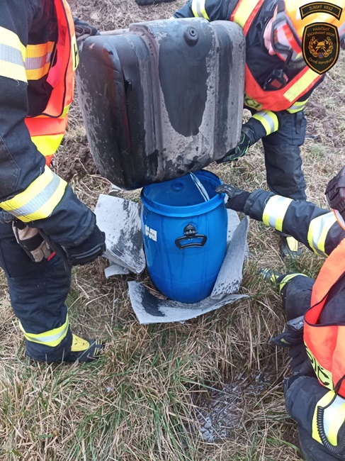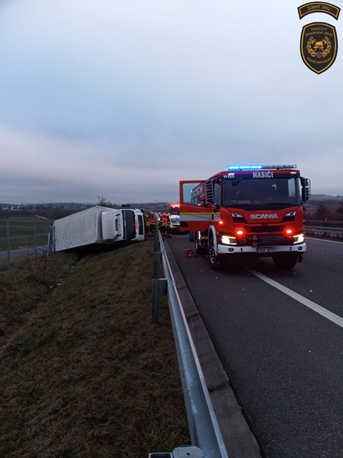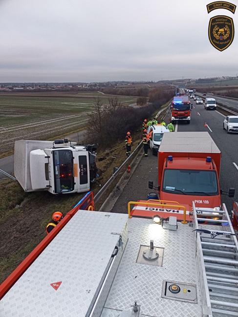 Dvě jednotky hasičů poté mířily na 26. kilometr dálnice D55, kde došlo ke střetu osobního auta s nákladním. Po nárazu nákladní vůz skončil na boku za svodidly vedle silnice, osobák zůstal stát na cestě. „Hasiči u vozidel provedli protipožární opatření a odpojili autobaterie. Nákladní automobil měl poškozenou nádrž. Aby nafta nevytekla ven, přečerpali ji hasiči do barelů. Nehoda se obešla bez zranění,“ sdělila Javoříková.