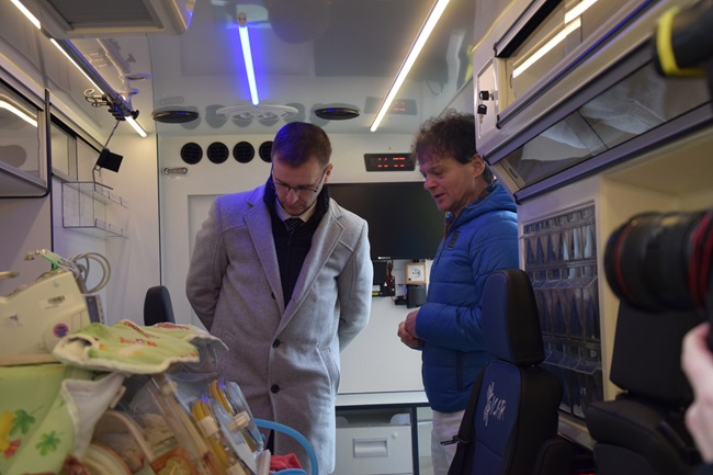 Oproti stávající sanitce má ta nová zcela jiné vnitřní uspořádání, především průchod z kabiny řidiče do ambulantního prostoru a jiné rozmístění zdravotnických přístrojů. Na změnách záchranáři spolupracovali s neonatologickým oddělením Baťovy nemocnice, vedeným primářem Jozefem Mackem. „Další viditelnou změnou je celkem pět míst k sezení včetně řidiče. V případě potřeby je tak nově možné spolu s dítětem transportovat i matku. Sanitní vůz je vybaven tak, že umožňuje provádět kompletní resuscitační i intenzivní péči během cesty,“ doplnil Jozef Macko. Pacient je vždy v transportním inkubátoru. Ten je majetkem zlínské nemocnice a do sanitky se nakládá bezprostředně před výjezdem.