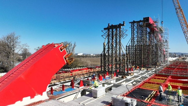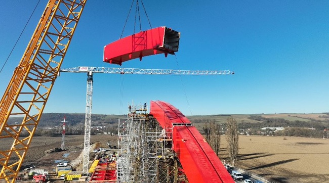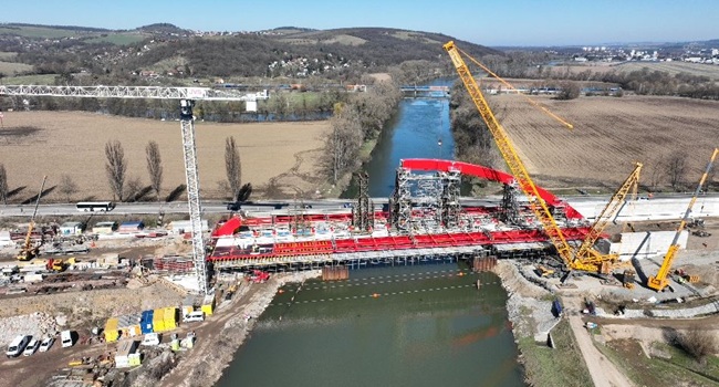 Ocelová konstrukce mostu v plné šíři dálnice bude společná pro oba jízdní směry. Směrové pruhy na mostě budou od sebe odděleny konstrukcí ocelového oblouku a závěsů, na kterých je zavěšený ocelový trám spřažený s betonovou deskou.