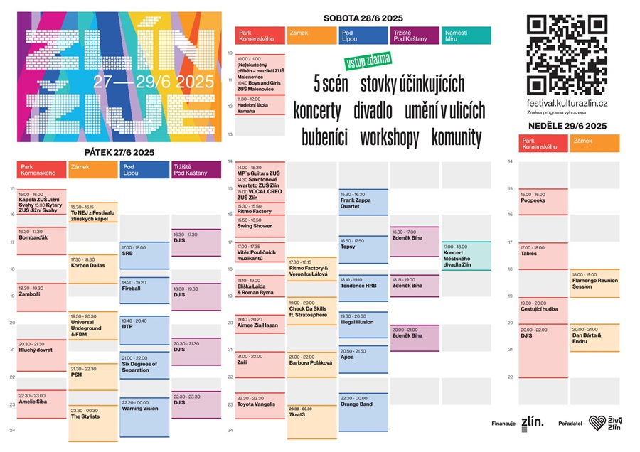 Festival Zlín žije se letos koná počtvrté a opět slibuje pestrý program v ulicích města. Zábava se bude odehrávat u zámku, v parku Komenského, Pod Lípou, na náměstí Míru i na Tržišti Pod Kaštany.