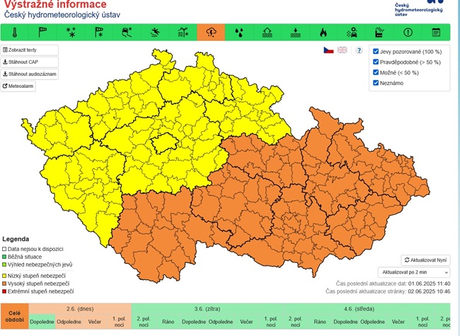 Varování pro oblast Zlínského kraje vejde v platnost dnes v poledne a potrvá až do půlnoci. „Očekává se výskyt velmi silných bouřek doprovázených většími kroupami kolem 3 centimetrů a nárazy větru kolem 90 kilometrů za hodinu, v menší míře i přívalovými srážkami kolem 40 milimetrů,“ stojí ve vydané výstraze.