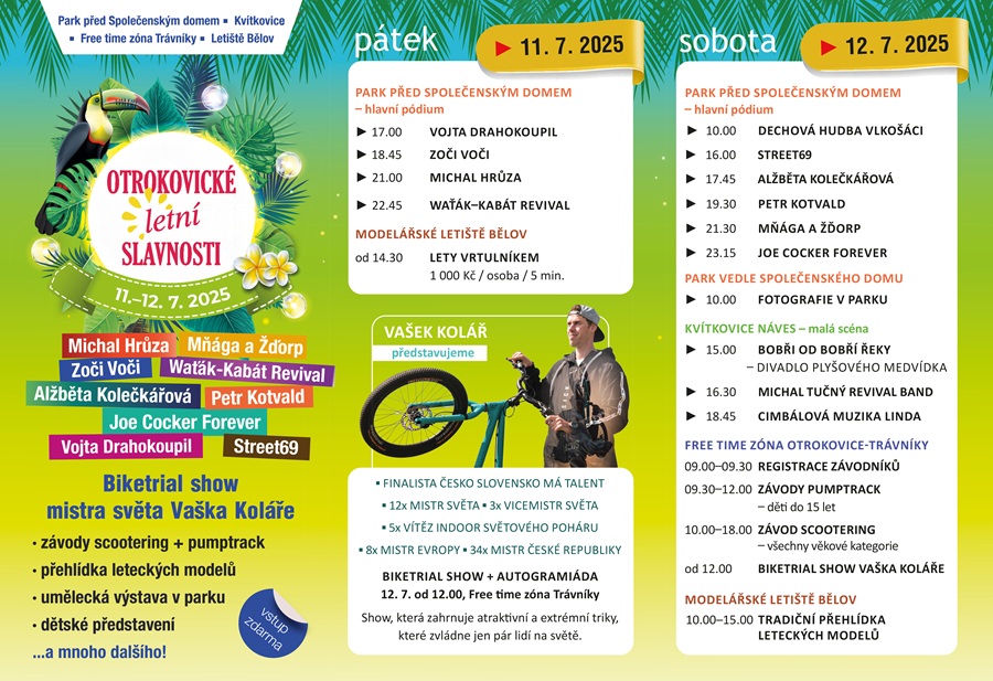 V sobotu se program rozšíří i mimo centrum města. Na své si přijdou nejmenší návštěvníci – na návsi v Kvítkovicích je připravené dětské divadelní představení „Bobři od Bobří řeky“, následované koncerty Michala Tučného Revival Bandu a Cimbálové muziky Linda. Freetime zóna na Trávníkách ožije závody Scootering CZ & Pumptrack CUP 2025, které nabídnou skvělou podívanou na koloběžkách i kolech. Mezi největší taháky patří biketrialová show mistra světa Vaška Koláře, která nadchne malé i velké.