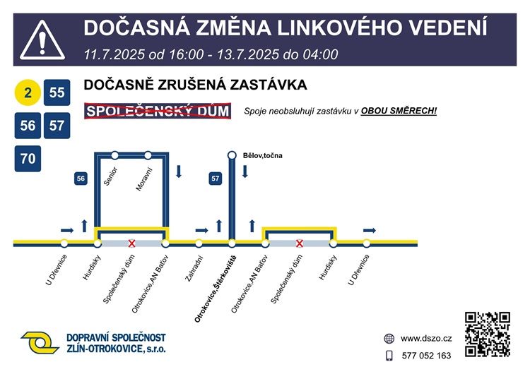 Linky, kterých se bude týkat uvedená výluka, budou označeny jako X2, X55, X56, X57 a X70. Spoje pojedou vždy ze zastávky Hurdisky rovnou na zastávku Otrokovice-aut. nádr. Baťov. Linka 56 pojede ze zastávky Hurdisky po ulici Erbenově na zastávku Senior a dále pokračuje po standardní trase na Otrokovice-Štěrkoviště. V opačném směru pojedou vozy všech linek ze zastávky Otrokovice-aut. nádr. Baťov přímo na zastávku Hurdisky. Časy odjezdů jednotlivých linek se nemění. Na zastávce Společenský dům bude vyvěšena informace pro cestující o jejím dočasném zrušení.