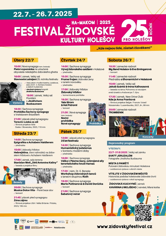 Festival zahájí pietní vzpomínka na oběti holocaustu, následovat bude slavnostní program ve Velkém sále zámku a otevření výstavy Svatý Jeruzalém fotografa Jindřicha Buxbauma. Výběr jeho izraelských snímků doplní fotografie z Holešova, a výstava vznikla ve spolupráci s fotografem Jindřichem Štreitem.