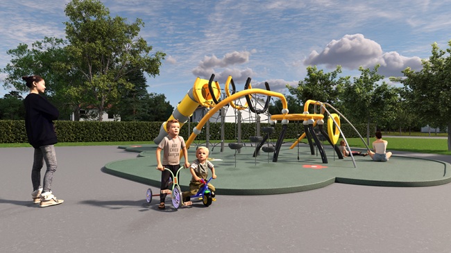 Před školou tak nyní vzniká herní sestava s nápaditým designem připomínajícím včelu a hravé malby na zemi, které vybízejí ke spontánnímu pohybu. Zadní část hřiště pak doplní lajnování pro míčové sporty.