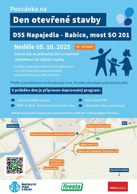 Most se veřejnosti otevře jen na jediný den, ještě před tím, než po něm v prosinci vyjedou první řidiči.Součástí akce bude volná prohlídka mostu a informační zóny zhotovitele. Připravená je také bezplatná kontrola zraku v rámci kampaně Řidič se dívá. Parkování bude možné na vyhrazeném parkovišti na dosud nezprovozněné části dálnice D55 před mostem.