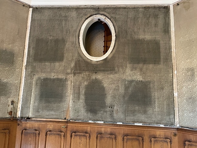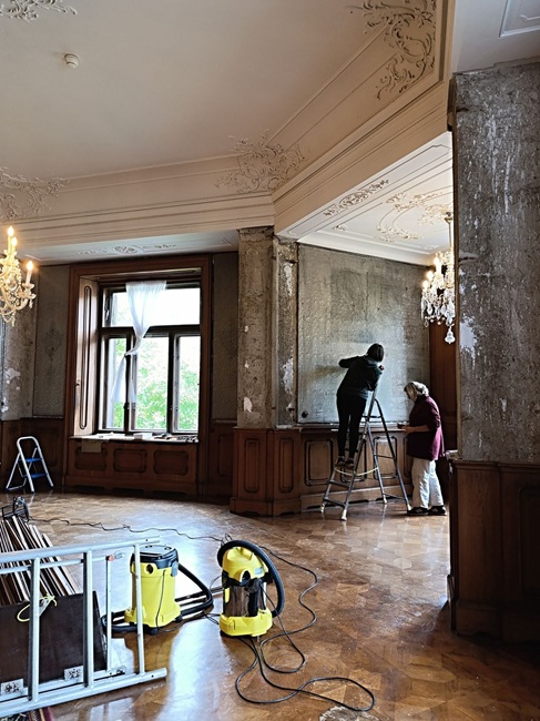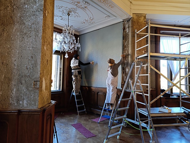 Původní staré tapety restaurátoři vyčistili, zafixovali a zakryli trhliny. Poté je kompletně překryla nově utkaná replika. „Z původních tapet jsme společně s kolegyněmi odstranily povrchové nečistoty a prach, zafixovaly všechna poškození a nainstalovaly 50 čtverečních metrů nově utkané látkové tapety. Replika tapet je zhotovena z damašku ve vzoru vytkávané moaré, mám z ní velkou radost. Na základě digitálního zpracování původního vzoru se opravdu velmi vydařila, barevnost naprosto odpovídá původní barvě historické tapety,“ přiblížila textilní restaurátorka Radka Kalabisová.