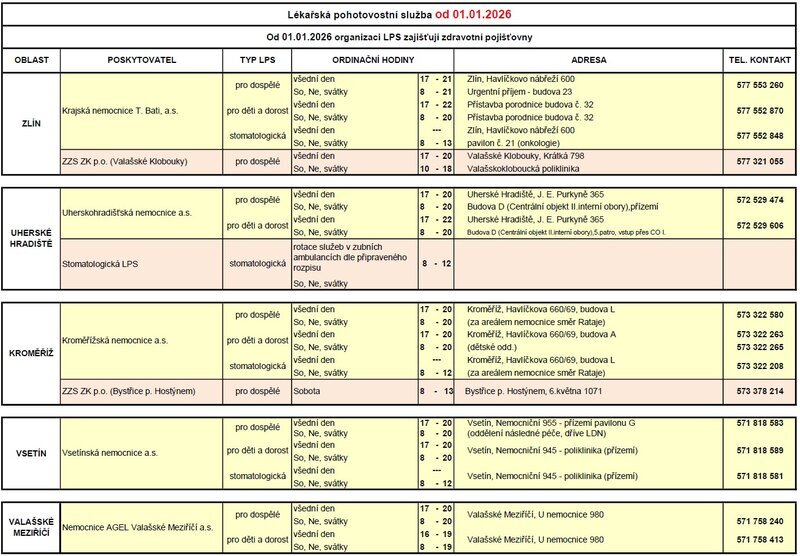 Největší změna čeká pacienty v Bystřici pod Hostýnem. Od nového roku bude lékařská pohotovost otevřena jen v sobotu od 8 do 13 hodin. V Rožnově pod Radhoštěm a Uherském Brodě se provoz LPS pro dospělé ruší úplně.