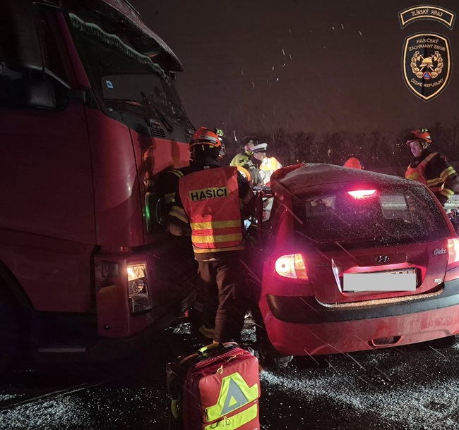 Řidička ve voze značky Hyundai najížděla včera krátce před devatenáctou hodinou v Napajedlech na dálnici ve směru na Přerov. V té době mírně sněžilo a silnice pokryl sníh. „V pravotočivé zatáčce dostala smyk a přejela do protisměru, kde v tu dobu sjížděl z dálnice kamion s návěsem. Její vozidlo narazilo do kamionu levou boční částí a řidička utrpěla velmi závažná zranění,“ popsala policejní mluvčí Monika Kozumplíková.