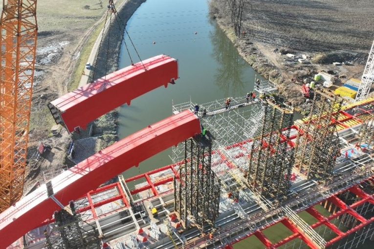 Přes dálniční most u Napajedel se už klene první část ocelového oblouku